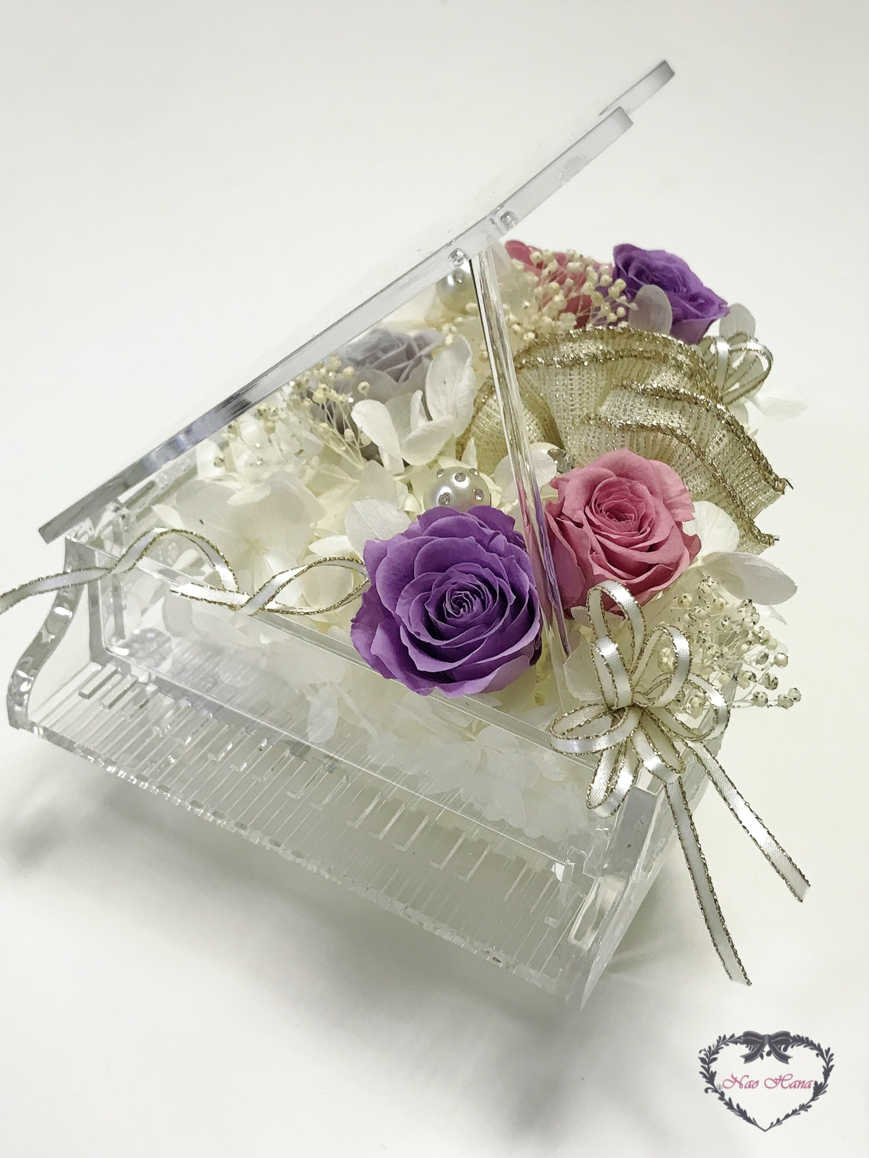 美しいプリザーブドフラワーを優雅にあしらわれたピアノアレンジは、見ているだけで幸せな気分に包まれます。
